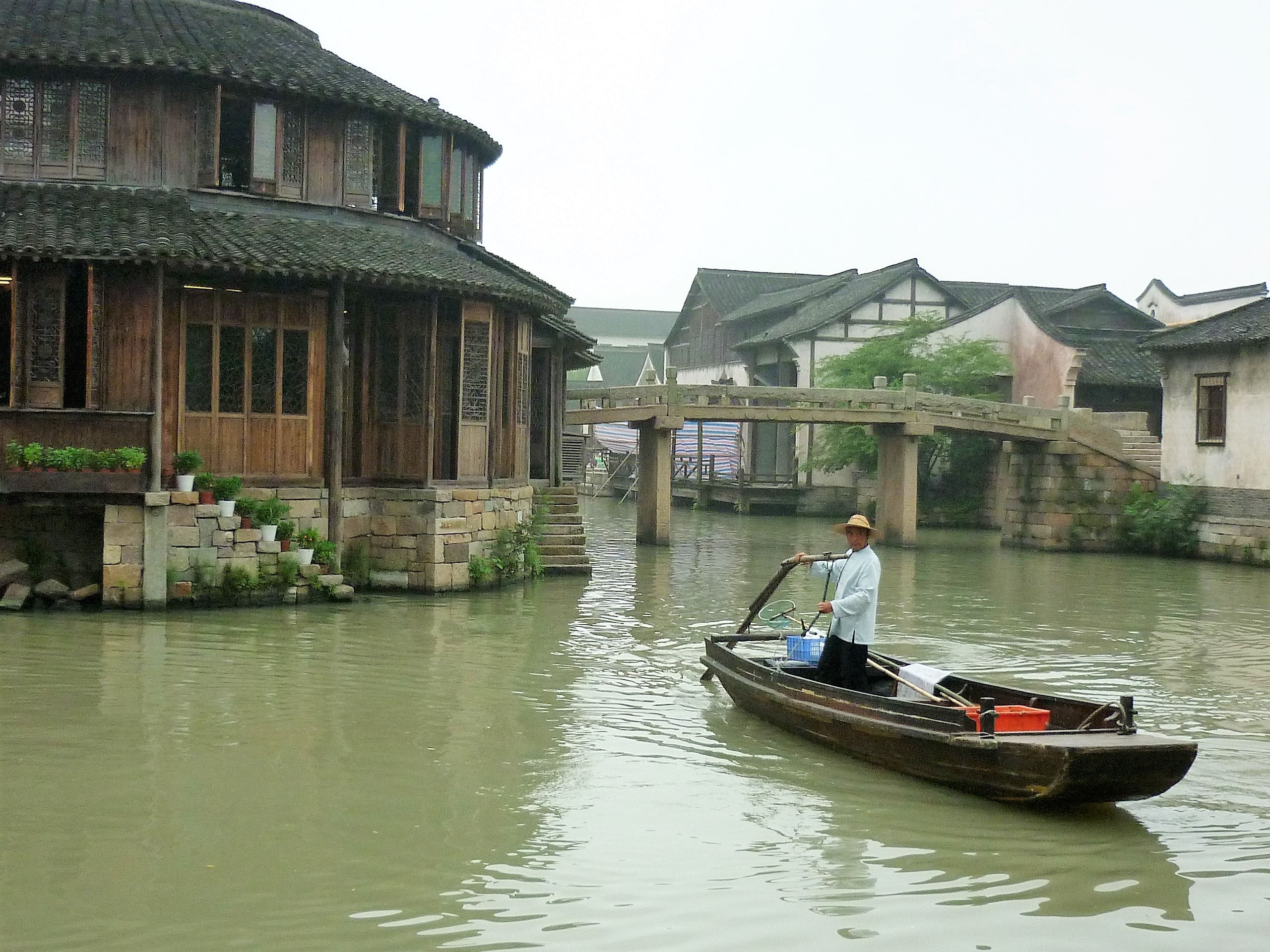 Do druhé části se jelo minibusem, který evidentně odradil většinu čínských turistů, protože tato část byla prázdná. Konečně jsme měli pocit, že jsme ve vodním městě. Jednopatrové řadové domky jsou lemovány vodním přítokem a opticky působí, že plavou na vodě.